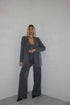 Coordinato composto da pantalone a palazzo elasticizzato in vita con chiusura bottone e cerniera anteriore, blazer foderato con spallina imbottita e top crop con coppa preformata e spallina regolabile.